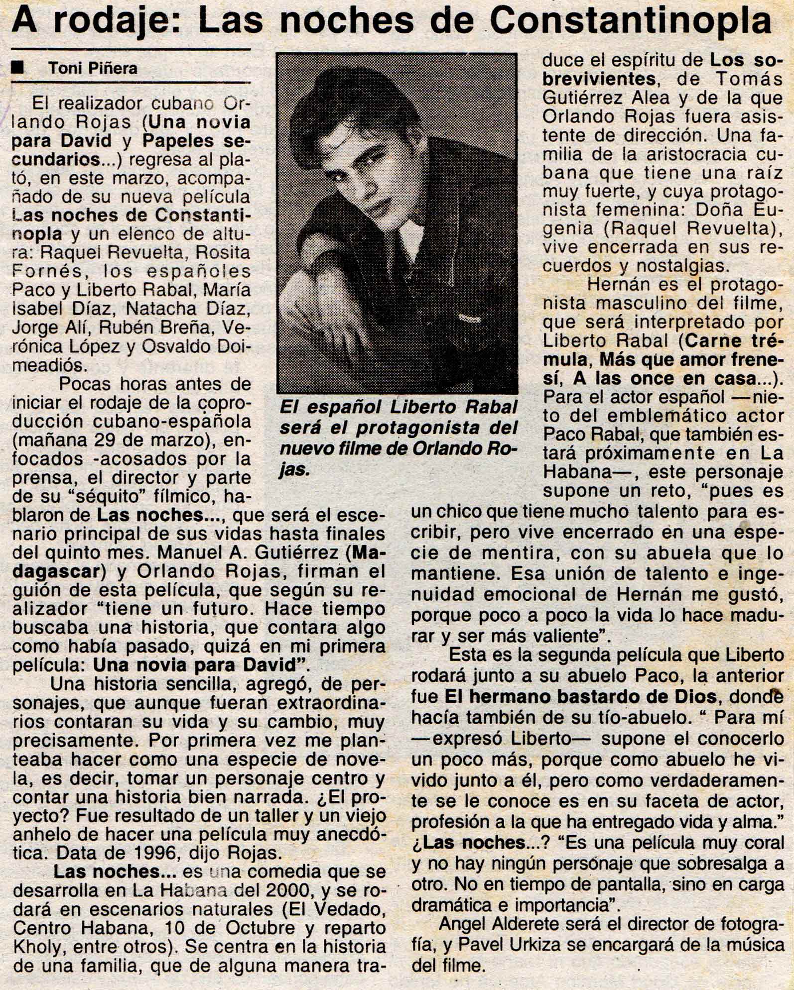 Resumen: Reseña de la película "Las noches de Constantinopla", que comenzará a rodarse próximamente. Contiene comentarios de su realizador, Orlando Rojas, y también del protagonista masculino del filme, el español Liberto Rabal