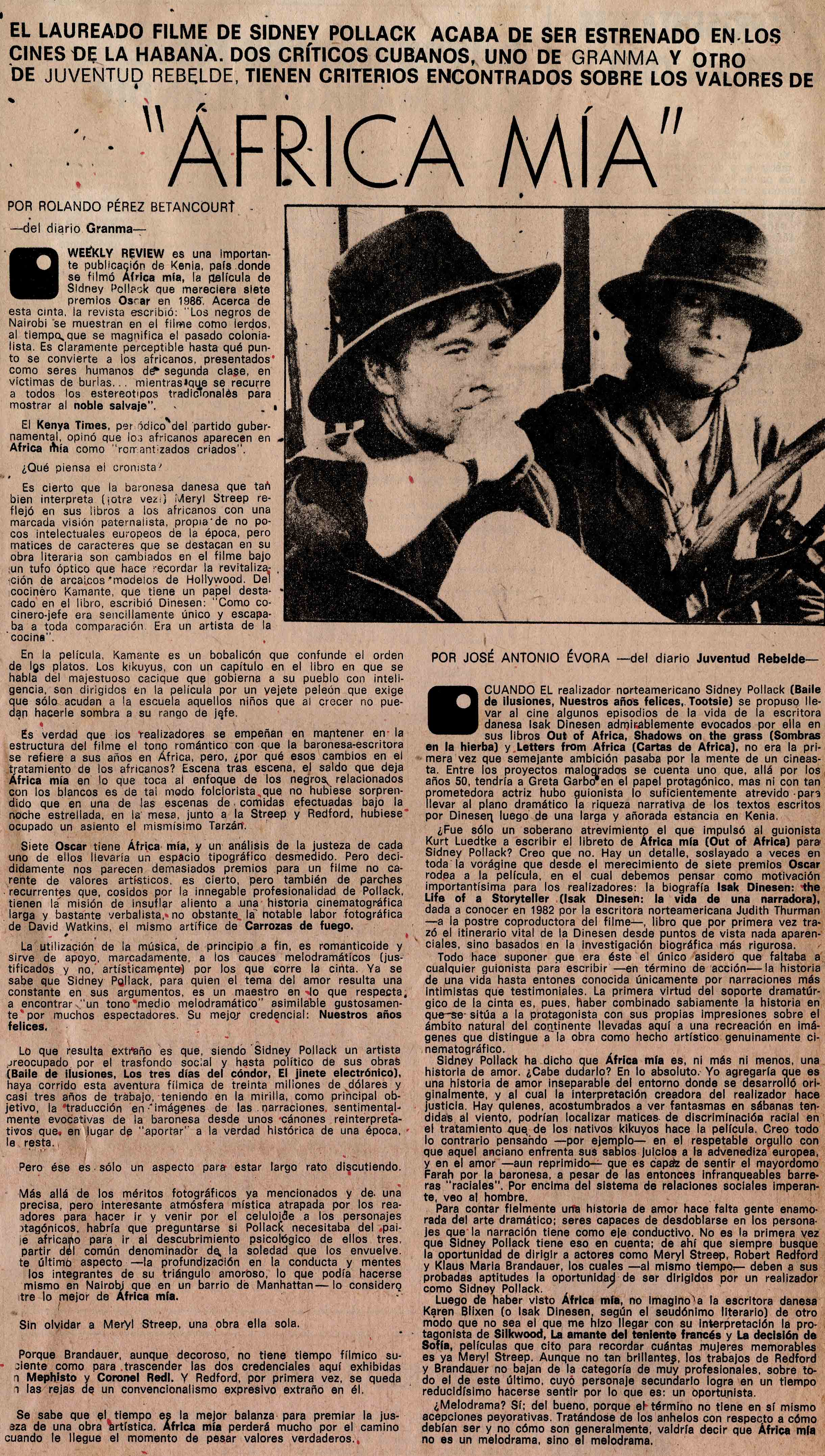 Resumen: Comentarios críticos sobre el filme norteamericano "África mía", dirigido por Sidney Pollack