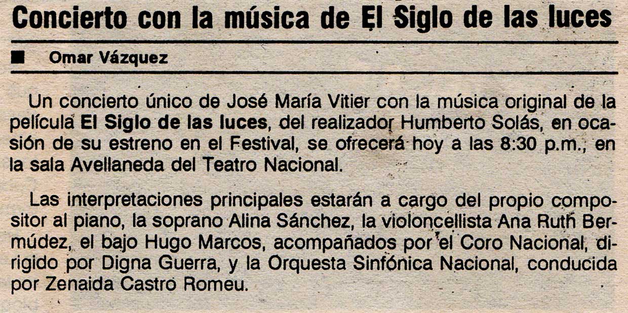 Resumen: Nota de prensa sobre un concierto único de José María Vitier con la música original de la película "El siglo de las luces", del realizador Humberto Solás