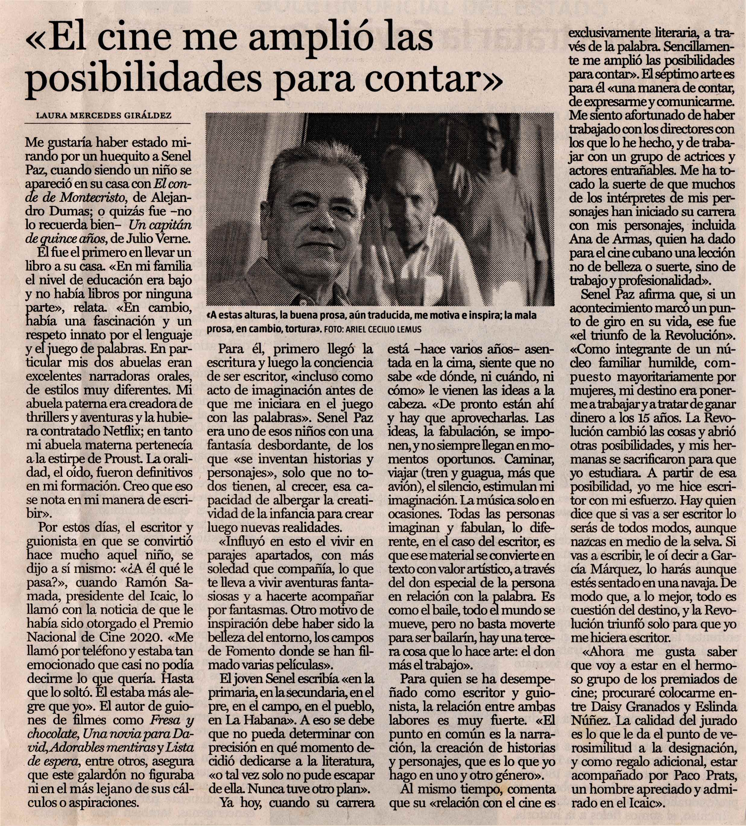 Resumen: Conversación con el escritor y guionista cubano Senel Paz con motivo de habérsele otorgado el Premio Nacional de Cine 2020
