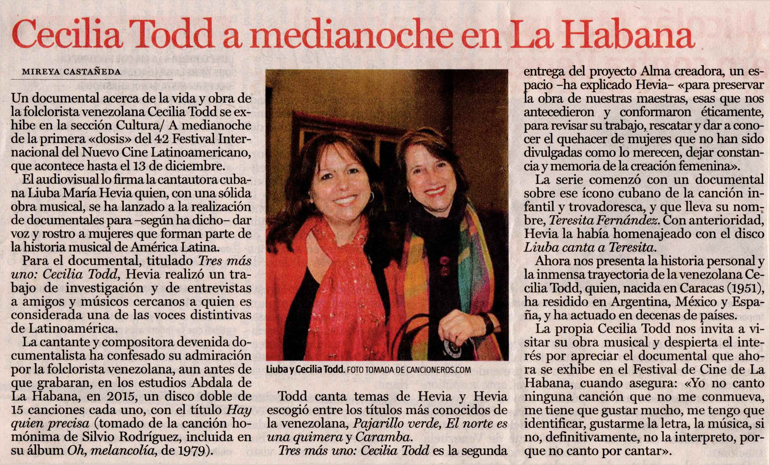 Resumen: Reseña del documental "Tres más uno: Cecilia Todd", dirigido por la cantautora cubana, ahora también realizadora, Liuba María Hevia
