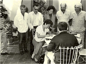 De pie: Héctor García Mesa (Cuba), Guido Araujo (Brasil), Alquimia Peña (Cuba), Geraldo Sarno (Brasil) y Sergio Muñiz (Brasil). Sentados: María Rita Galvao, directora de la Cinemateca Brasileña y Gabriel García Márquez, presidente de la FNCL